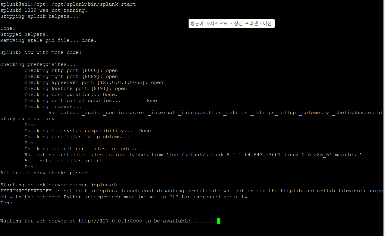 - 이 상태에서 바로 splunk start 명령을 입력하면
