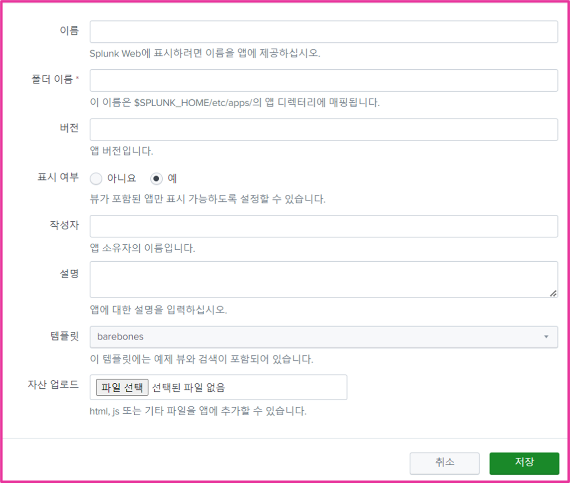 | /opt/splunk/bin/splunk create app <app 이름> -template [ barebones | sample_app ] |