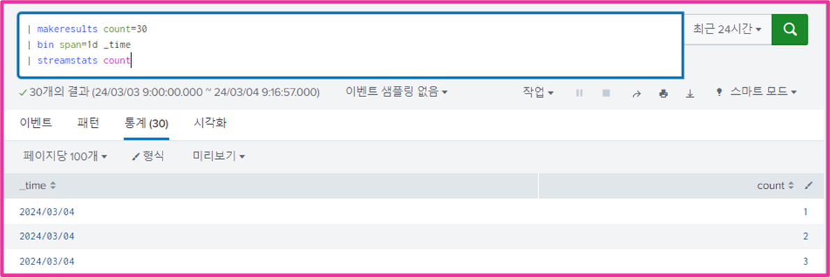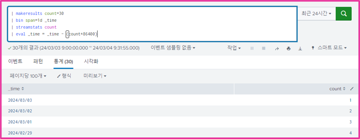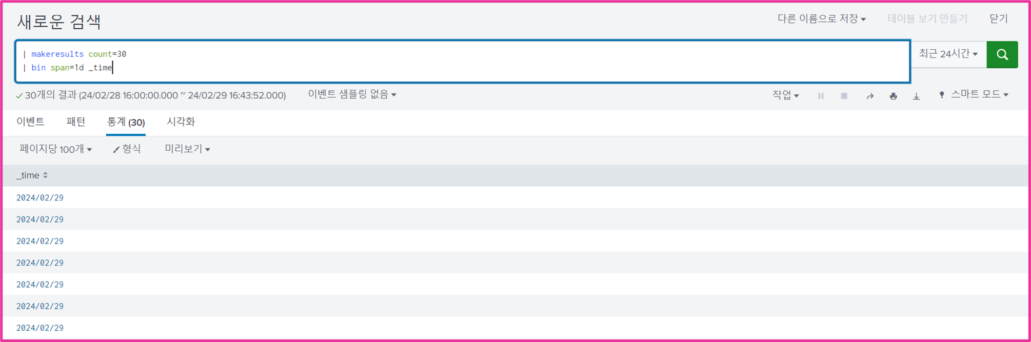 다음과 같이 30개의 이벤트가 생기고 _time이 검색 시간으로 정해진다.