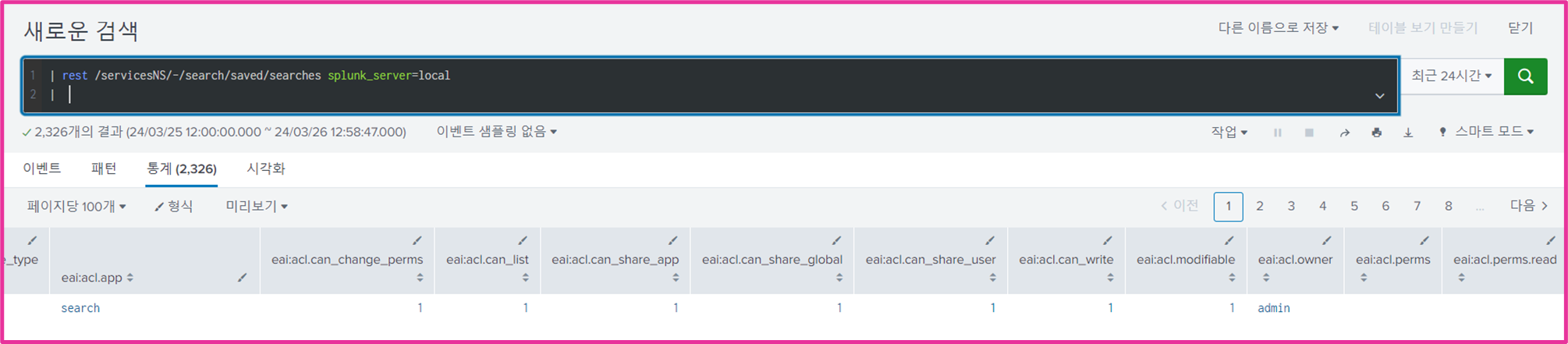 | | rest /servicesNS/-/search/saved/searches splunk_server=local 빨간색 search 대신에 앱이름을 넣어주면 원하는 앱 아래서 볼 수 있는 저장된 검색 리스트를 모두 볼 수 있다. |