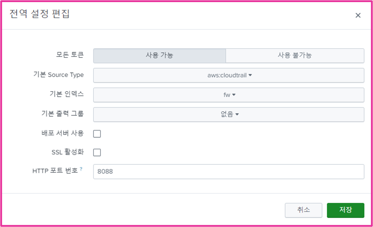 - <port> : HEC 포트 번호, 기본값은 8088, HEC 전역 설정에서 변경 가능