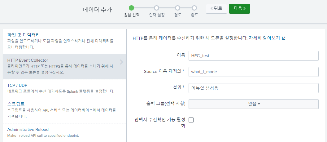 - sourcetype 설정 : 원하는 것