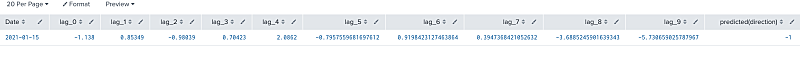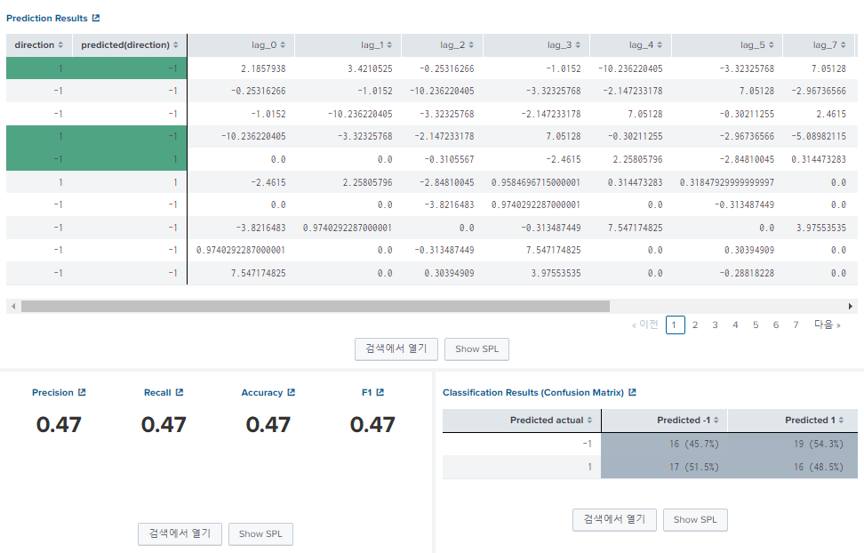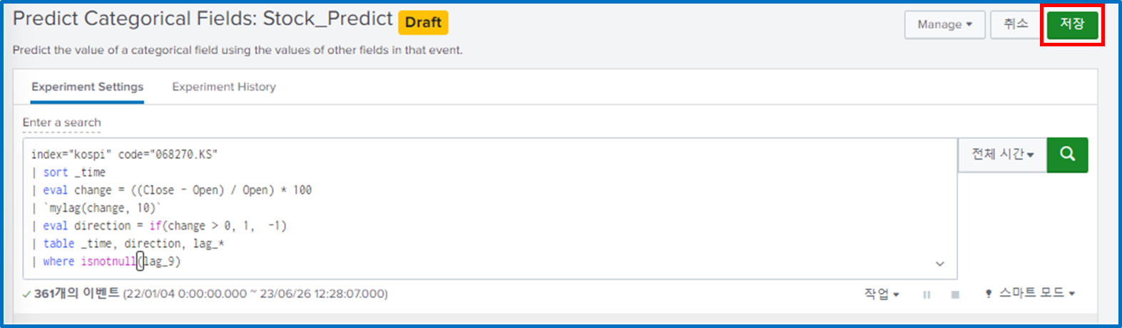 예측 필드로 "direction"을 그리고 사용할 필드로는 "lag_0 ~ lag_9" 까지 입력했다.