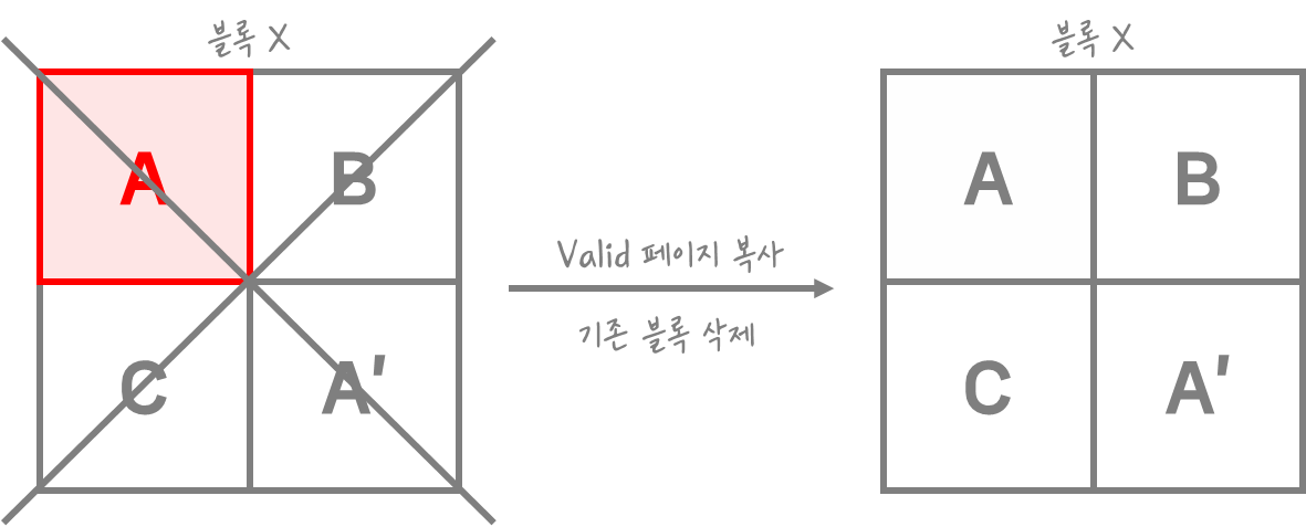 결과적으로 블록 X의 valid 페이지는 B, C, A`가 된다.