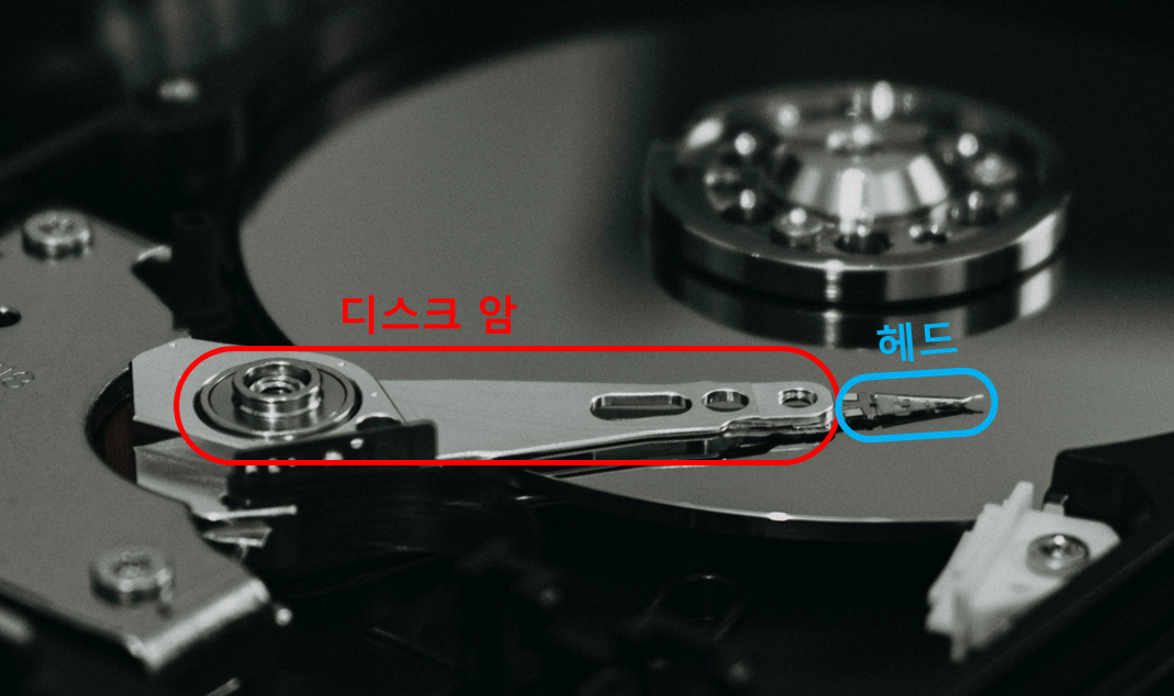 그리고 헤드를 원하는 위치로 이동시키는 디스크암이 헤드와 붙어있다.