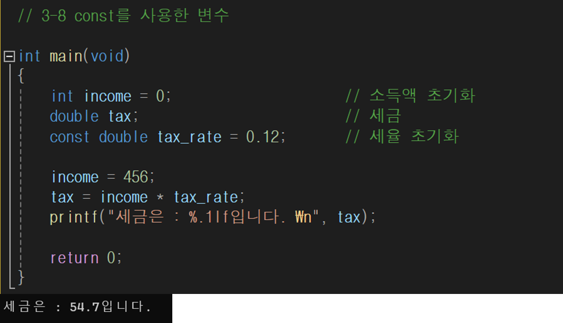 변수 선언할 때 그 앞에 const를 붙이면 초기화된 값을 바꿀 수 없다.