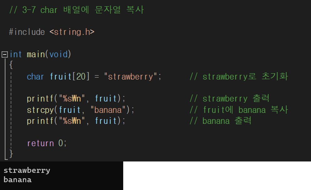 char 배열에 새로운 문자열을 저장하려면 strcpy 함수를 사용한다.