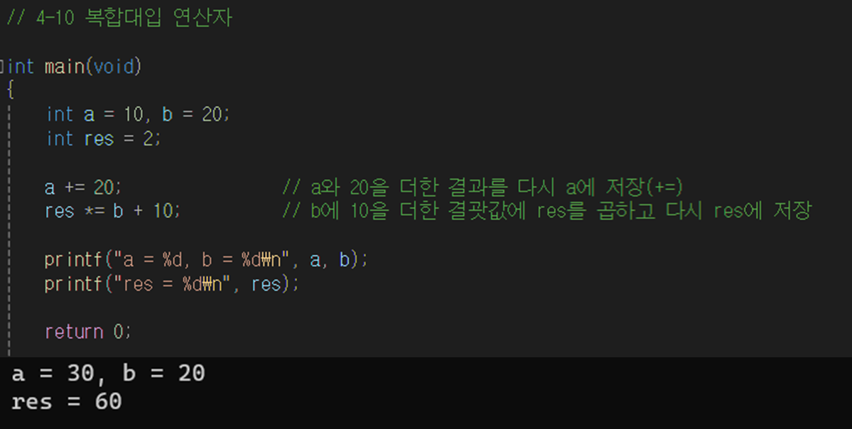 복합대입 연산자는 연산 결과를 다시 피연산자에 저장한다.