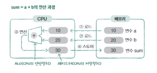 - 메모리에 있는 a와 b의 값을 CPU의 저장 공간인 레지스터에 복사 (로드)