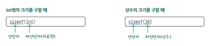 sizeof(피연산자)로 표기하며 피연산자의 대상은 변수, 상수, 수식, 자료형 등이 될 수 있다!