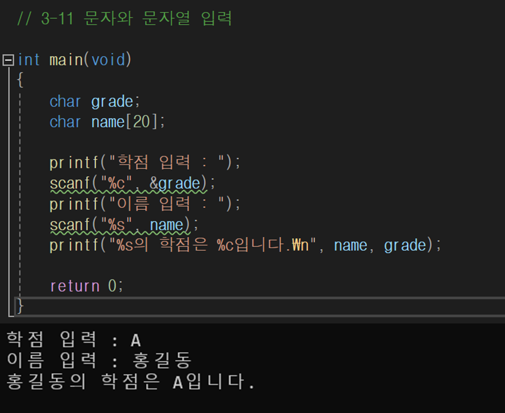 문자열은 char 배열에 %s 변환 문자를 사용해서 입력하는데, 문자열을 입력할 때는 배열명에 &를 붙이지 않는다.