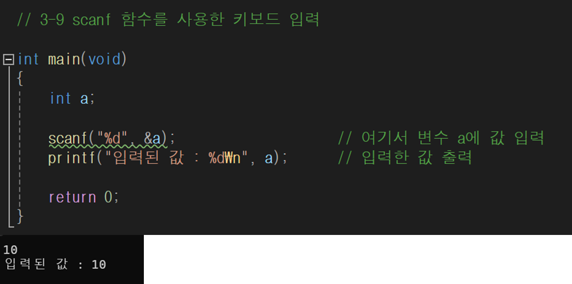 scanf 함수는 키보드에서 입력한 값을 변수에 저장할 때 사용한다.