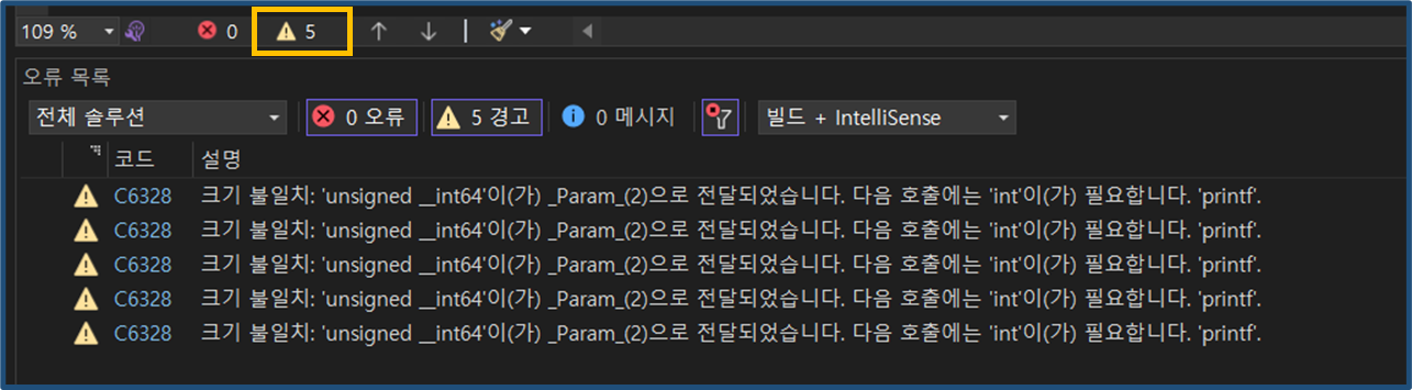 경고 메시지가 불편하면 변환문자를 %zd로 바꾸거나 다음 문장을 소스 코드 첫줄에 추가하면 된다.