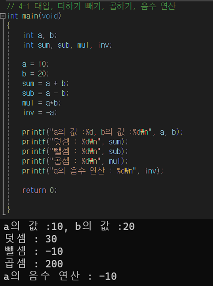 - 빼기 연산자는 피연산자를 하나만 사용할 때 피연산자의 부호를 바꾸는 역할도 한다.