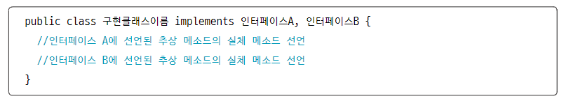 클래스 선언부에 implements 키워드를 추가하고 인터페이스 이름을 명시함