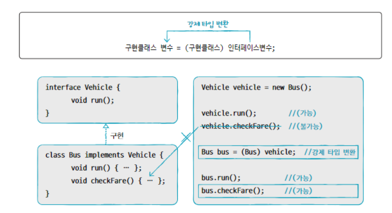 - 객체는 인터페이스에서 정의된 추상 메소드와 동일한 메소드 이름, 매개 타입, 리턴 타입을 가진 실체 메소드를 가지고 있어야 함