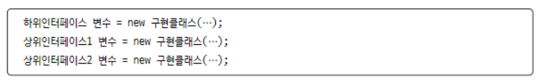 - 이 경우 부모 클래스 변수는 클래스이름1의 객체를 참조하고, 인터페이스 변수는 클래스이름2의 객체를 참조