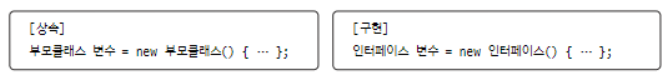 - 이 경우 부모 클래스 변수는 이름이 없는 자식 객체를 참조하고, 인터페이스 변수는 이름이 없는 구현 객체를 참조