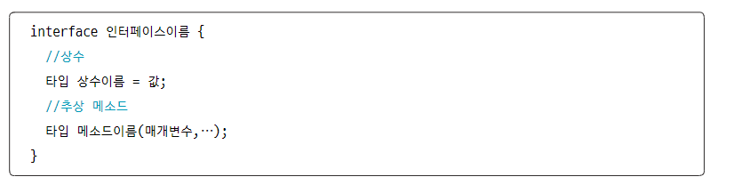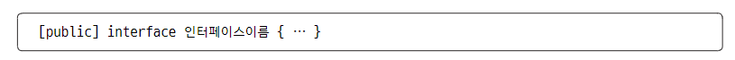 - 인터페이스 선언은 class 키워드 대신 interface 키워드 사용