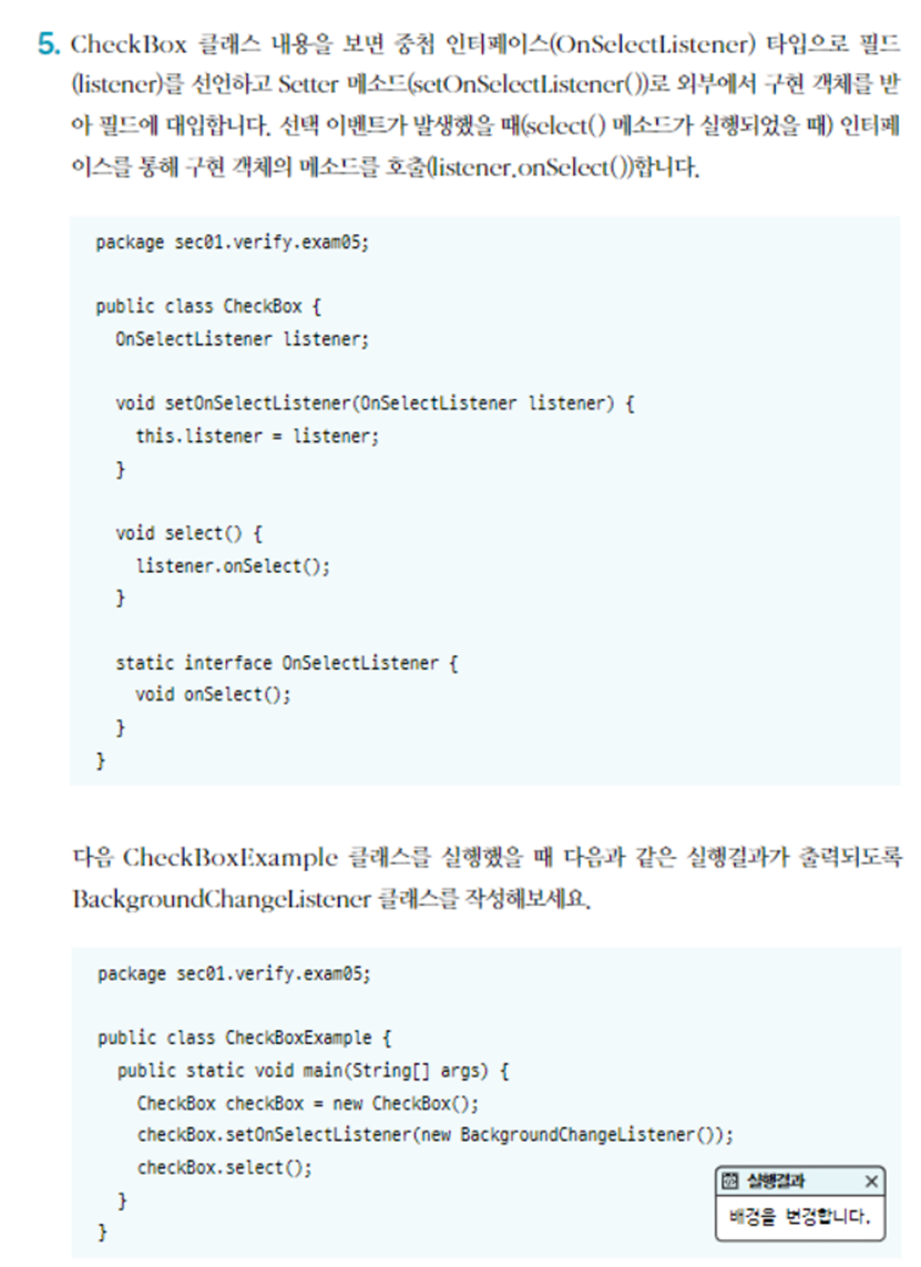 public class CheckBoxExample { public static void main(String[] args) { CheckBox checkBox = new CheckBox(); checkBox.setOnSelectListener(new CheckBox.OnSelectListener() { @Override public void onSelect() { System.out.println("배경을 변경합니다."); } }); checkBox.select(); } } |