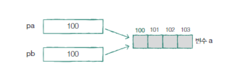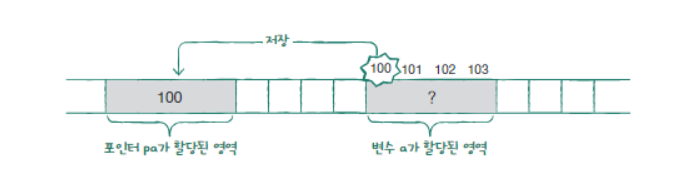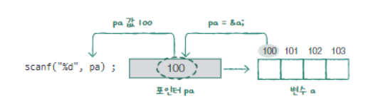 - 만약 변수 a가 메모리 100번지부터 103번지까지 할당되었다면 주소 값 100이 pa에 저장됨