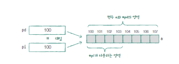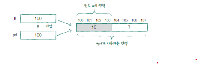 - 변수 p와 변수 pd는 모두 포인터지만 가리키는 자료형이 다르다