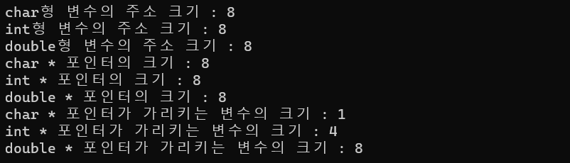 - 포인터의 크기는 컴파일러에 따라 다를 수 있으나 모든 주소와 포인터는 가리키는 자료형과