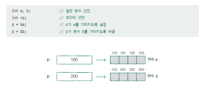 - 포인터 p는 a, b 중 어떤 주소를 대입하느냐에 따라 가리키는 변수가 바뀜