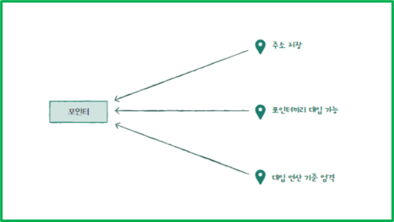 - 특정 변수의 주소 값은 바뀌지 않지만, 포인터는 다른 주소를 대입해 그 값을 변경할 수 있음