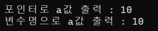 | #include <stdio.h> int main(void) { int a; int* pa; pa = &a; *pa = 10; printf("포인터로 a값 출력 : %d\n", *pa); printf("변수명으로 a값 출력 : %d\n", a); return 0; } |
