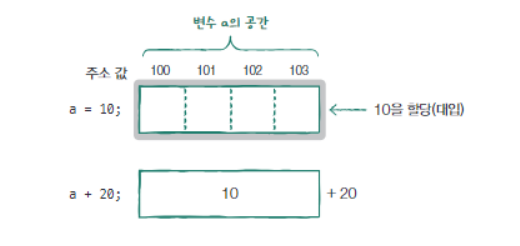 a + 20;과 같은 수식은 메모리 100번지부터 103번지까지 4바이트에 저장된 값과 20을 더하는 연산을 수행 - 변수명으로 메모리 공간이나 값을 간단히 사용할 수 있음!!